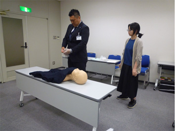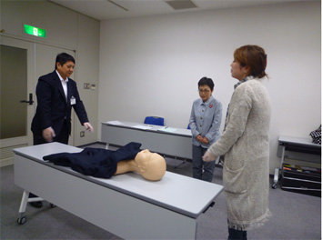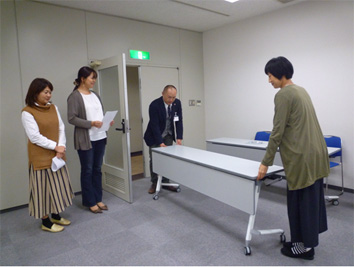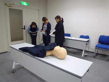 医療者から葬祭業従事者が、病院のベットからストレッチャーへ、ご遺体を移動する際の、ディスポーザブルグローブの着脱のタイミングを、医療者役、葬祭業者役、ご遺族役になってロールプレイング形式で体験していただきました。